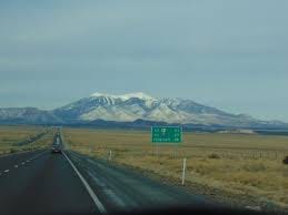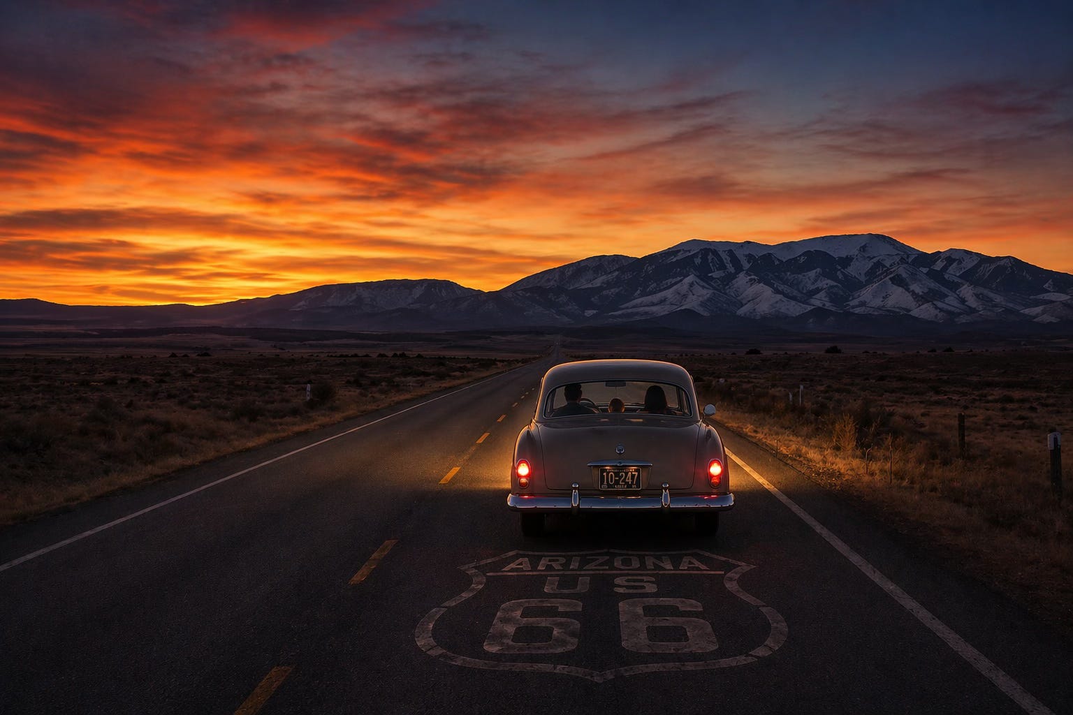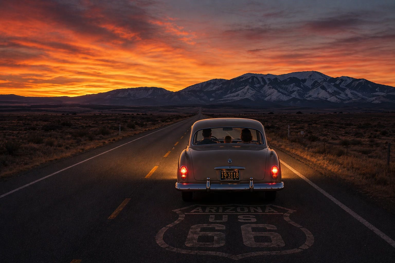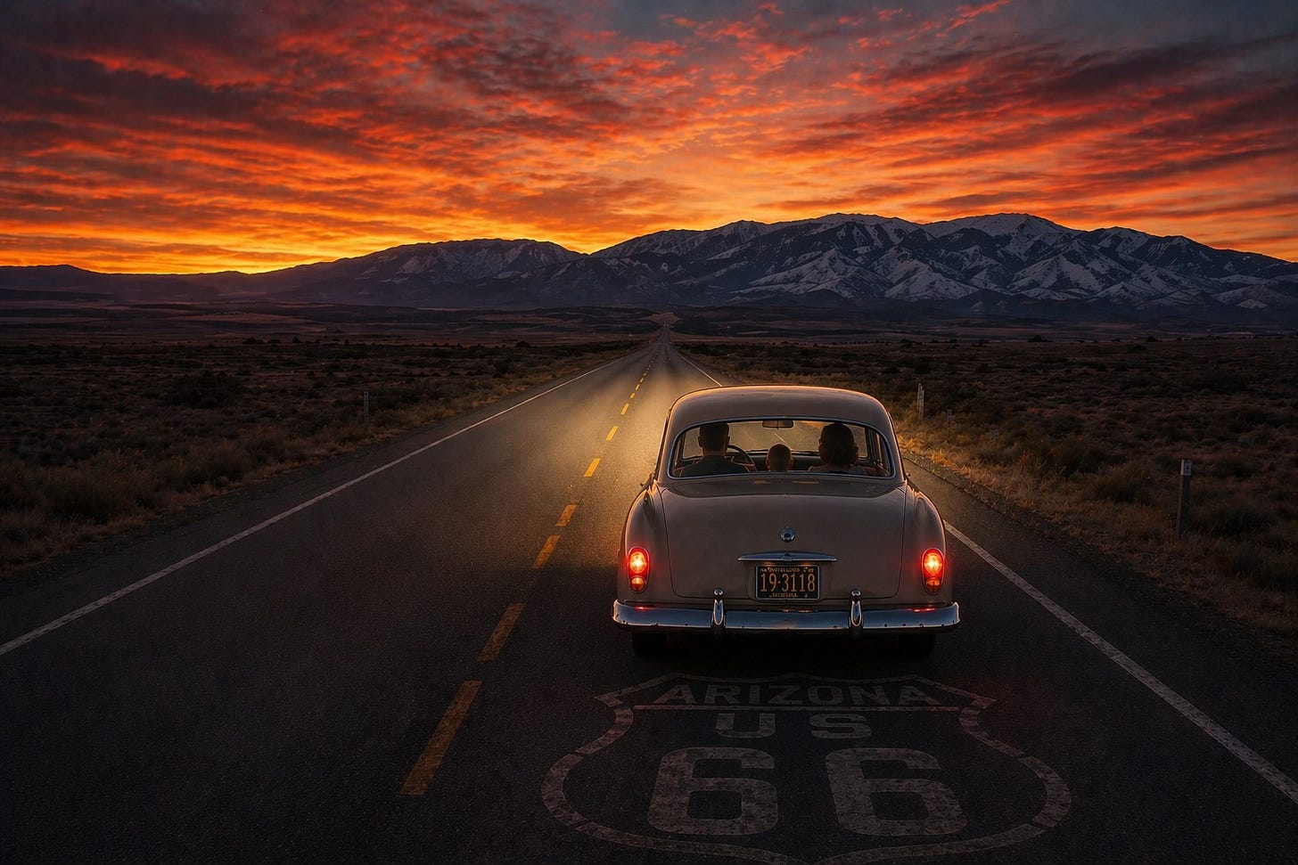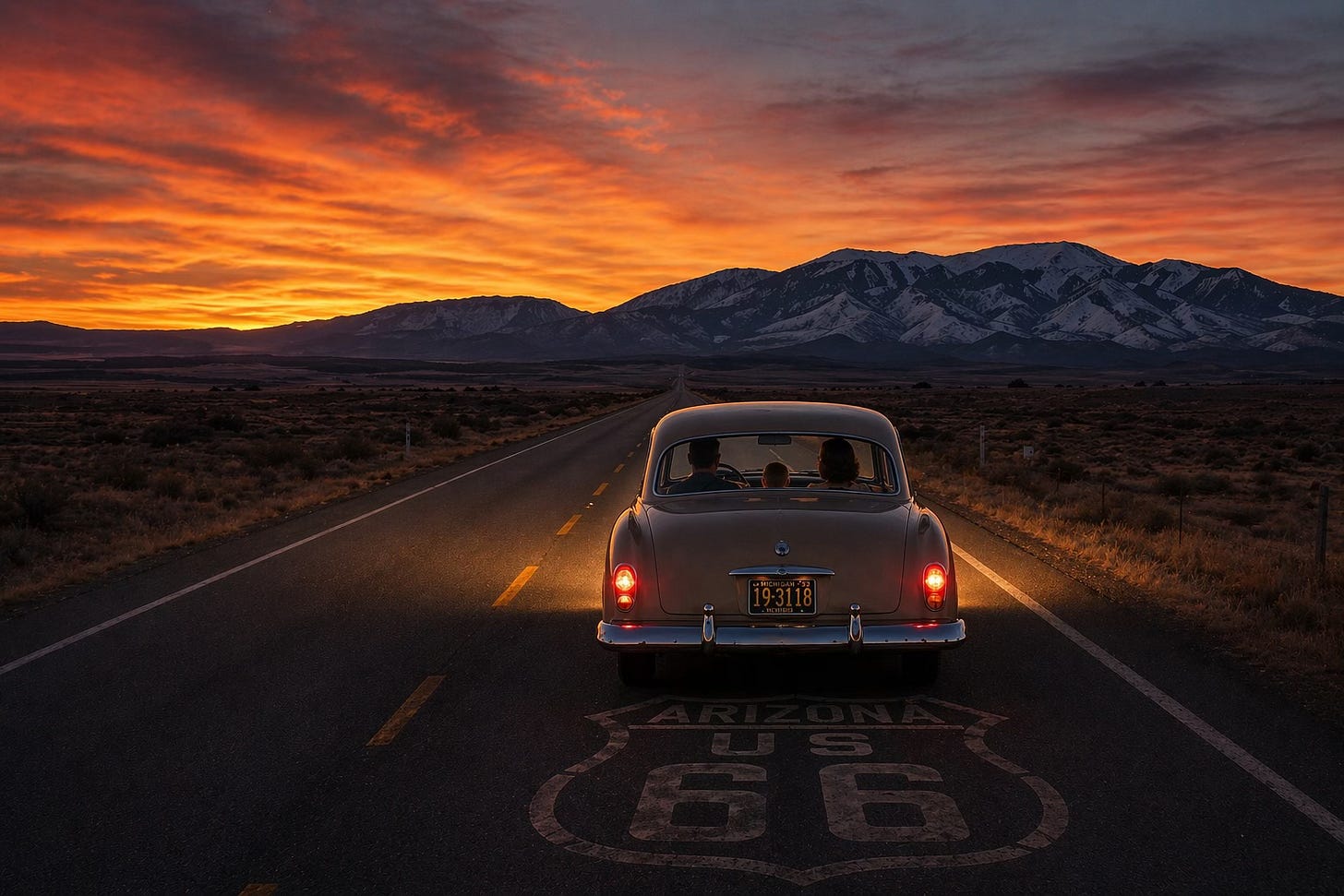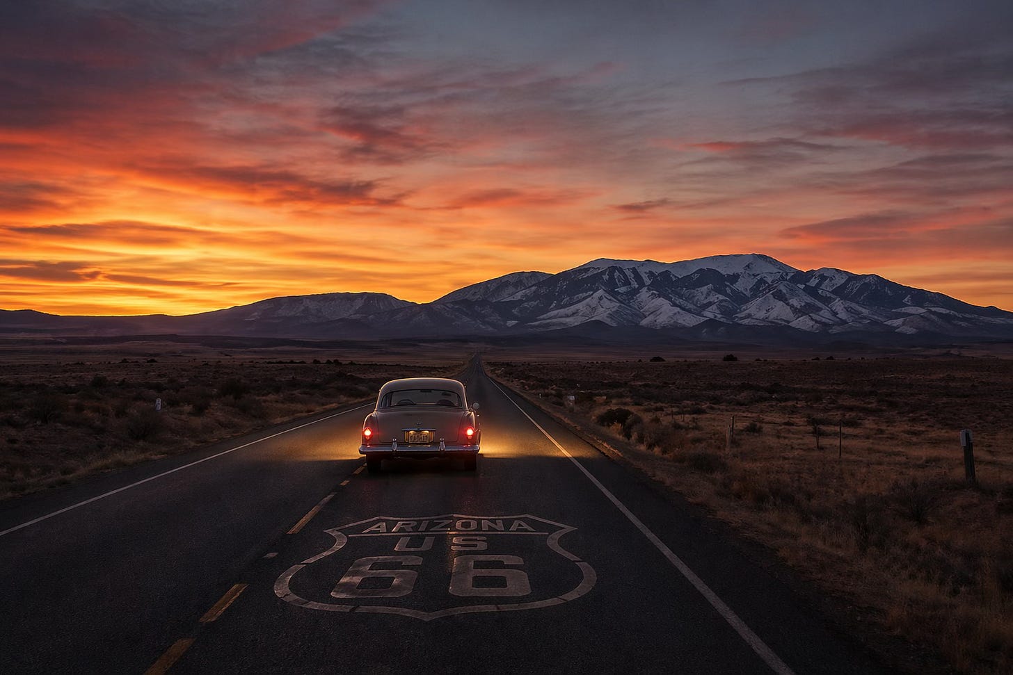ME — I'm not quite there yet, and this might be a bit tamer than you're hinting at, but I've thought about an image that might work for when we are driving through New Mexico/Arizona. I'm seeing our 1949 neutral colored DeSoto, driving west somewhere between Winslow and Flagstaff. We're alone on the road, dark enough to need car lights on but light enough to still see scenery. Road is straight, we see the car from behind, headlights on road, perhaps one of those places the highway shield with Arizona US 66 is painted on the asphalt. Headed west at sunset, December sky lit up above the snowy mountains where Flagstaff is located. The attached photo is just to show the orientation driving Winslow to Flagstaff, not to replicate or use.CHATGPT —