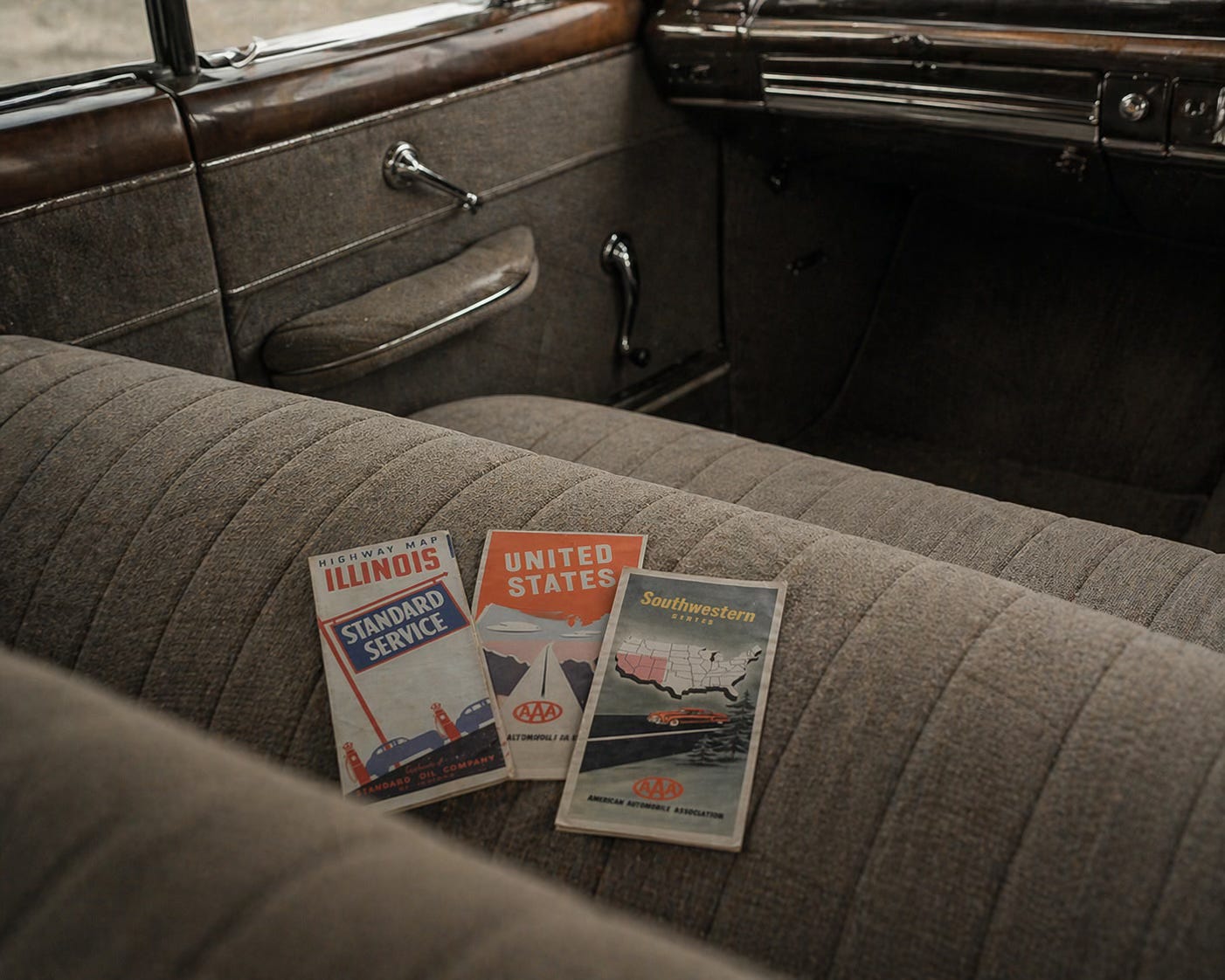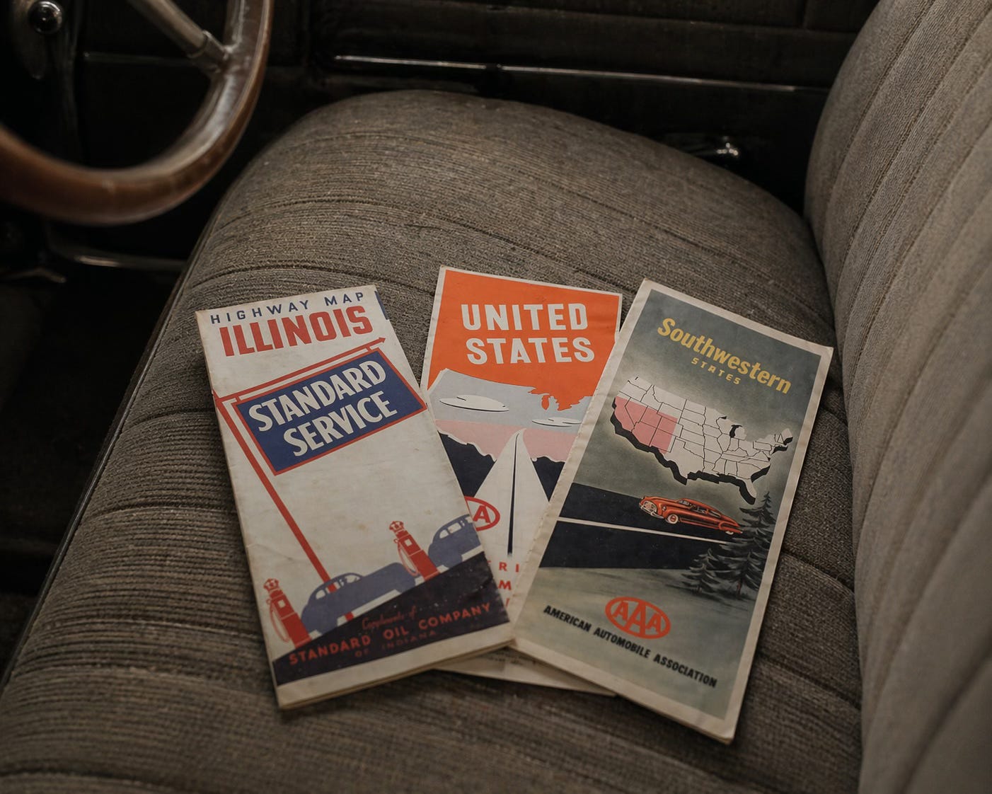 ME — I’d like these three maps placed casually on the middle of the front bench seat (between driver and passenger) of a 1950ish car, overlapping but enough text showing to identify them. Enough of the seat showing to be able to tell it’s a car seat.