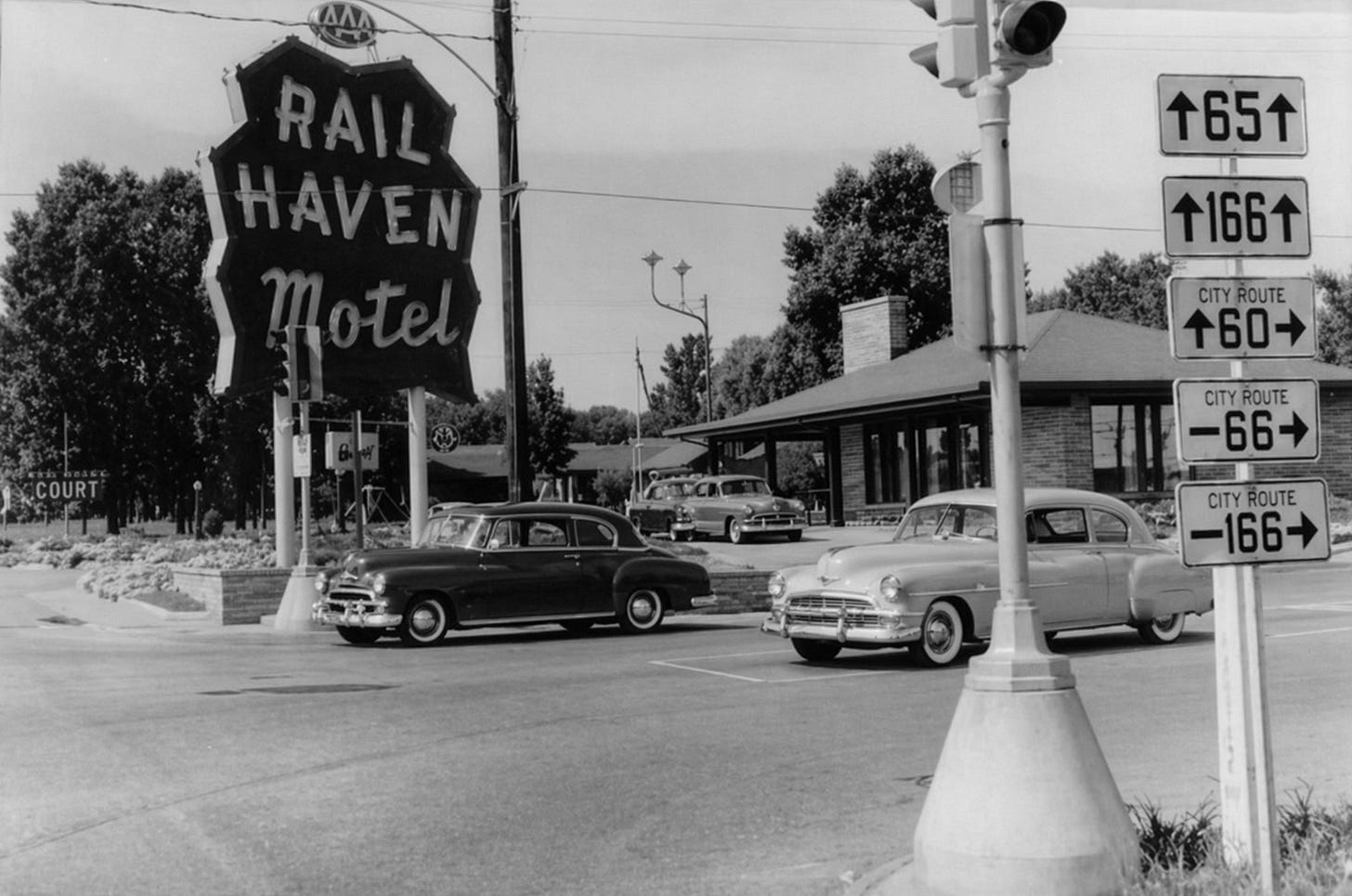 Next, I found a photo I wanted to use for our stop in Springfield Illinois. Nice shot of an intersection with a motel we could have stayed in and road signs full of 66s. But, at least a couple of the cars are later than 1953 models.