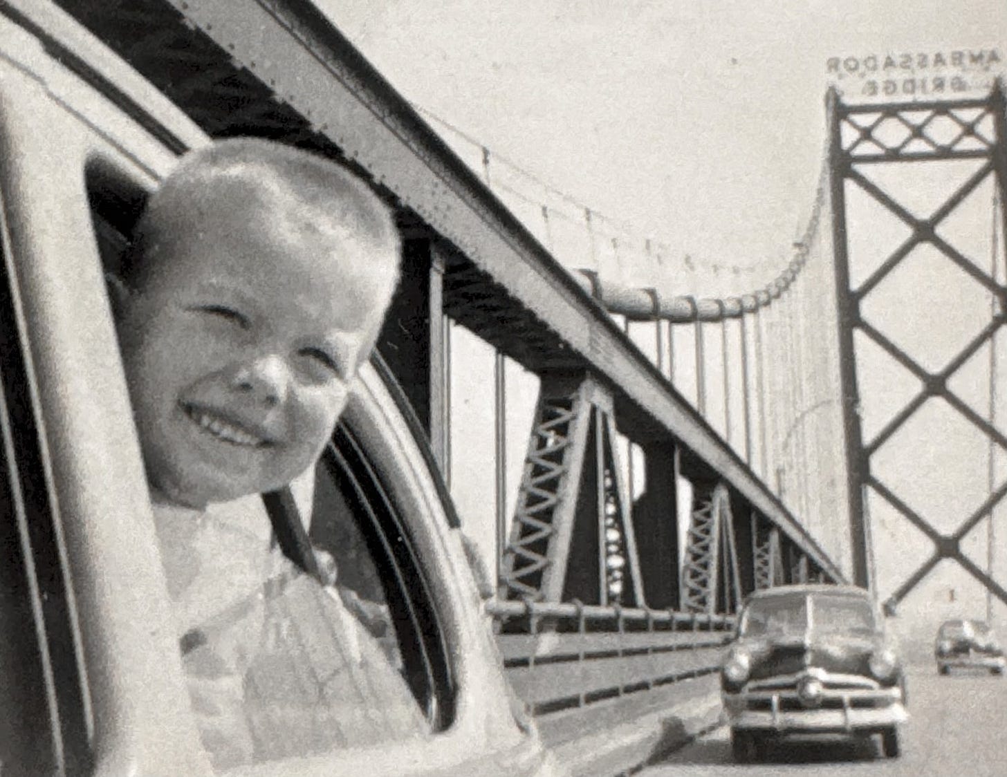 I had a photograph from 1953—one I’ve known all my life. A young boy (me) leaning out the window of a family car, grinning into the wind as we crossed the Ambassador Bridge from Detroit into Canada. It’s a perfect image of childhood—joyful, unselfconscious, and in motion.