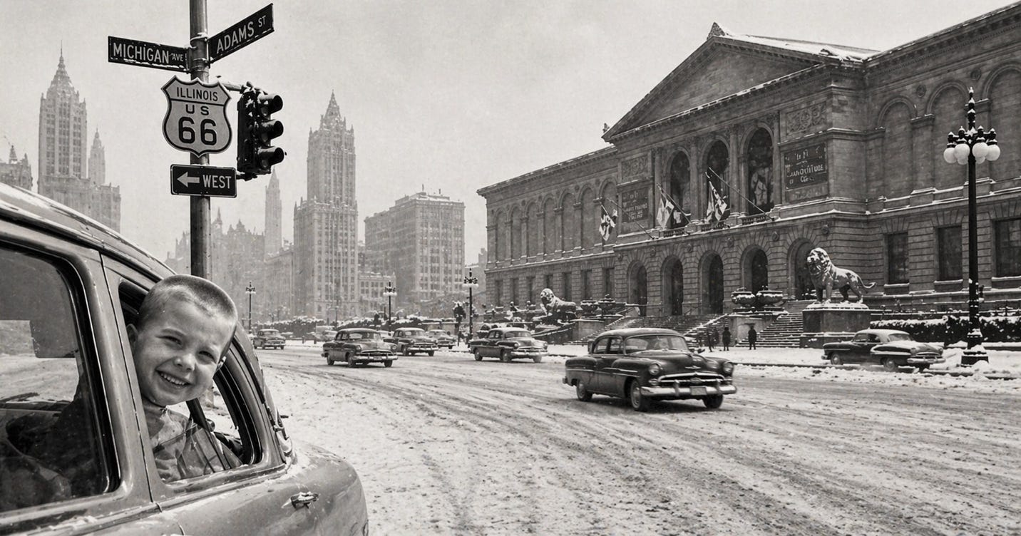 I was thinking it’s a shame it wasn’t from our “migration” trip on Route 66, for which I have exactly no photos. Until right then, for some reason, I hadn’t thought about image generation as a resource for the memoir project. In fact, even then I was only thinking in terms of AI “Photoshopping” the car and me onto a background photo of the corner in Chicago where US 66 starts from its eastern end.