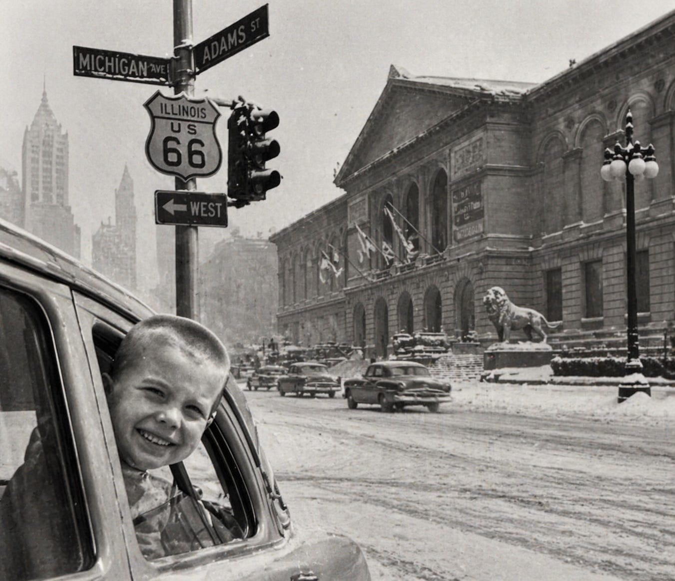 · Clear narrative flow: eye goes from the boy → street → Art Institute → skyline