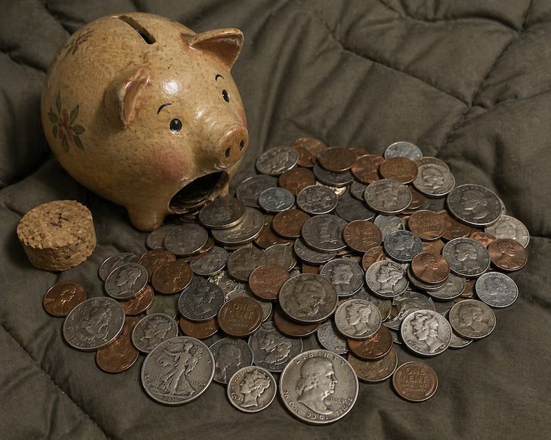 ME — Let's try something different. Picture a 1948-1953 vintage piggy bank—not too big, like 5" tall 6" long— with a cork at the bottom, uncorked and the coins emptied onto a soft surface like a sleeping bag. The coins are from 1920-1953 mintings, pennies, nickels, dimes, quarters, and include a few buffalo nickels and Mercury dimes. Coins are jumbled in a pile, showing both heads and tails. Include 3-4 of half-dollars (Walking Liberty and Franklin). Can you construct a muted color image of that? Big ask?
