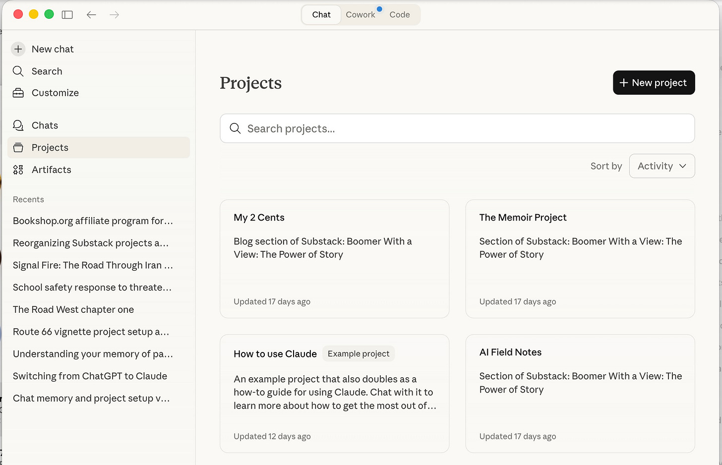The first screenshot shows Claude’s Projects screen. I created three projects — one for each of the three sections of my Substack (My 2 Cents, The Memoir Project, and AI Field Notes). The fourth is a built-in example project Anthropic provides called “How to Use Claude.” Think of each project as a dedicated workspace. When I start a new post or memoir vignette, I open the relevant project and start a new chat inside it. All the chats related to, say, the memoir live together in The Memoir Project. All the chats related to political and cultural commentary live in My 2 Cents. The organization mirrors the publication itself.