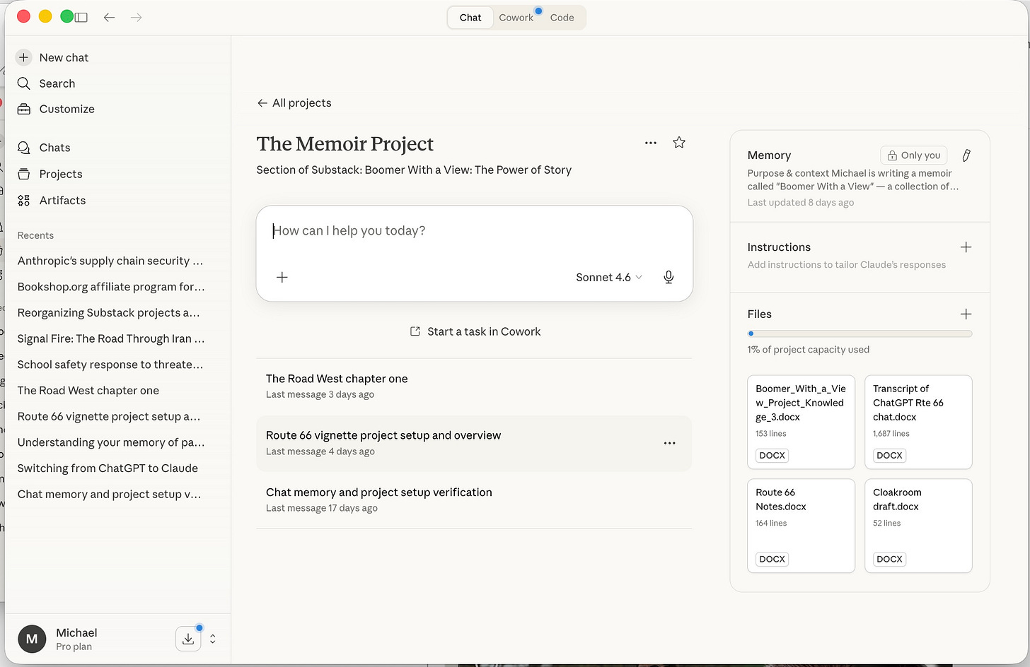 I began by uploading much of my Substack content to “brief” Claude quickly and thoroughly on my work history. I uploaded a summary of what I had started in ChatGPT on a new memoir vignette. The first thing we worked on was getting the workspace organized in a way that works for me and for Claude’s memory. I learned a couple of fascinating things about how the platform works in the process.